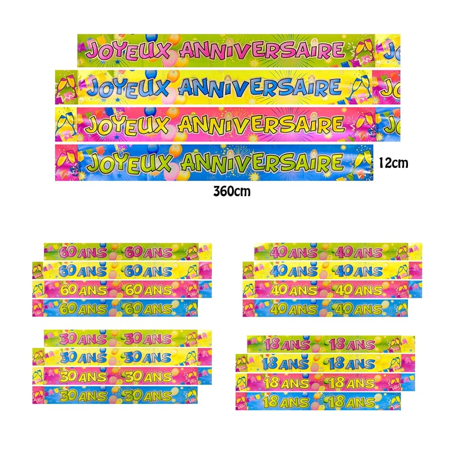 Elle affiche toute en longueur l'âge : 18, 30, 40 ou 60 ans ou encore l'inscription « Joyeux Anniversaire ».
