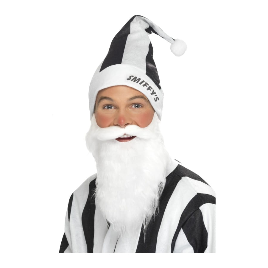 Déguisement de Père Noël de la marque Smiffy's, pour homme. Le set contient un chapeau et une barbe. Cette dernière est entièrement blanche, tandis que le chapeau est à rayures blanches et noires, avec un pompom et un rebord blancs. Ce sont des accessoires parfaits pour une tenue de Noël originale.