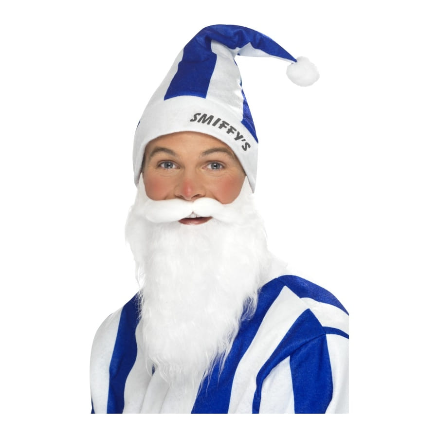 Déguisement de Père Noël Smiffy's, pour homme, composé d'une barbe blanche et d'un chapeau à rayures bleu et blanc, avec pompom. Ce type de déguisement convient particulièrement à une fête de Noël où vous devrez entretenir beaucoup d'enfants à la fois.