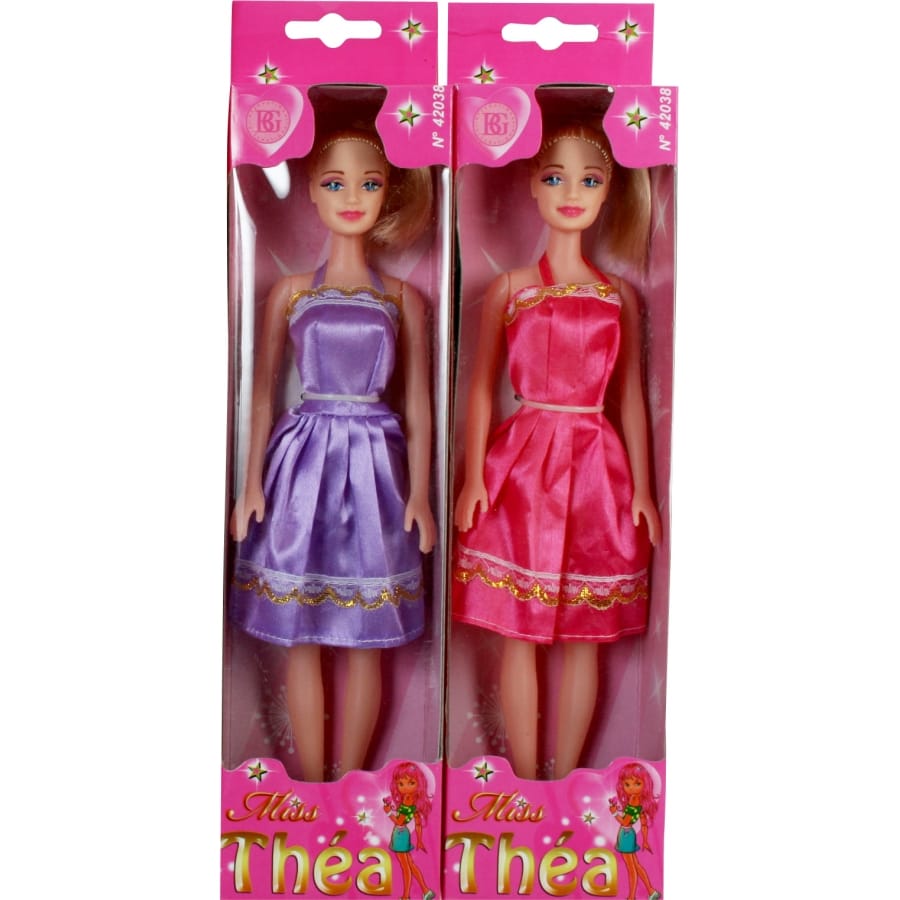 Votre fille a était sage, ou vous voulez offrir cette jolie poupée pour l'anniversaire d'une petite fille. Cette poupée miss théa en boite de 28 centimètre porte une robe de couleur rose ou violet. Pas de choix au niveau de la couleur.