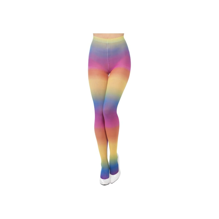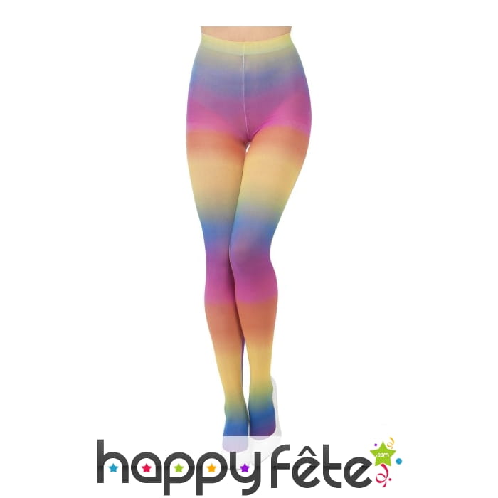 Osez apporter de la couleur à votre garde-robe. Inspirés de l'époque disco, ces bas opaques multicolores années 80 feront resplendir toutes vos tenues. Ce modèle combine d'une manière originale de multiples couleurs, disposés comme dans un arc-en-ciel. Il s'agit d'un collant indispensable, que vous pourrez porter occasionnellement avec une petite robe d'été. Vous pourrez aussi l'utiliser pour compléter un déguisement de clown par exemple.