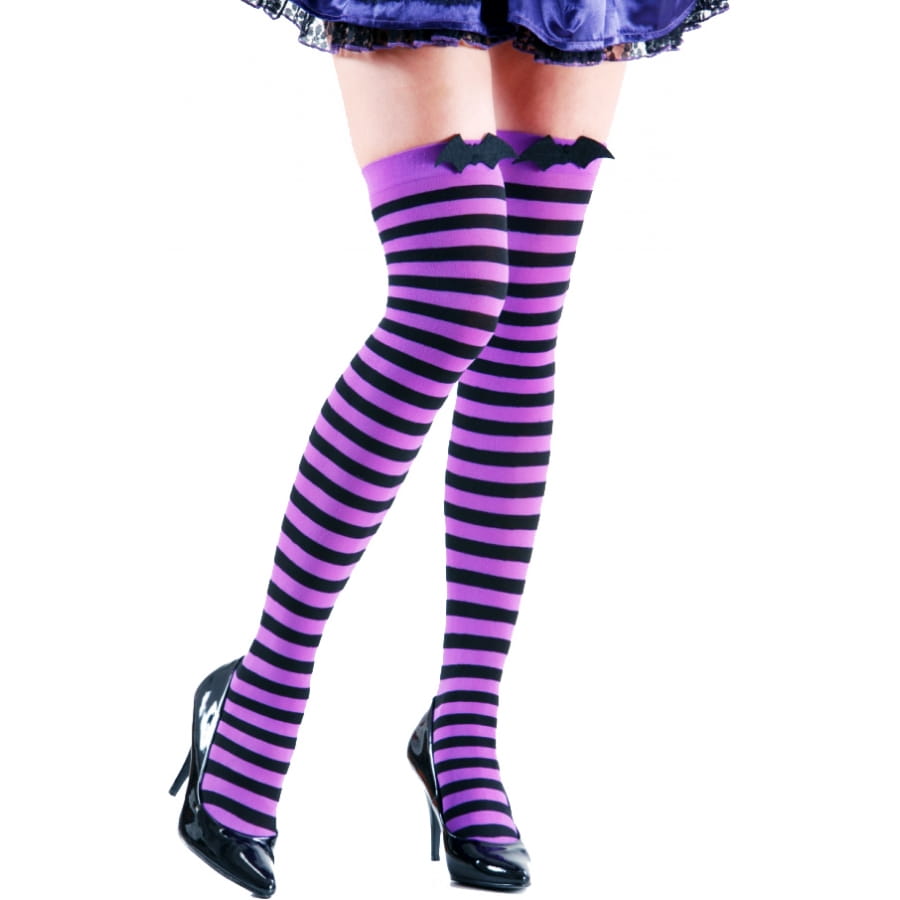 Paire de bas de 70 deniers pour femme. Les bas sont à rayures noires et violettes et chacun orné d'une petite chauve-souris noire sur le haut. Combinez-les avec d'autres accessoires assortis pour une tenue d'Halloween réussie.