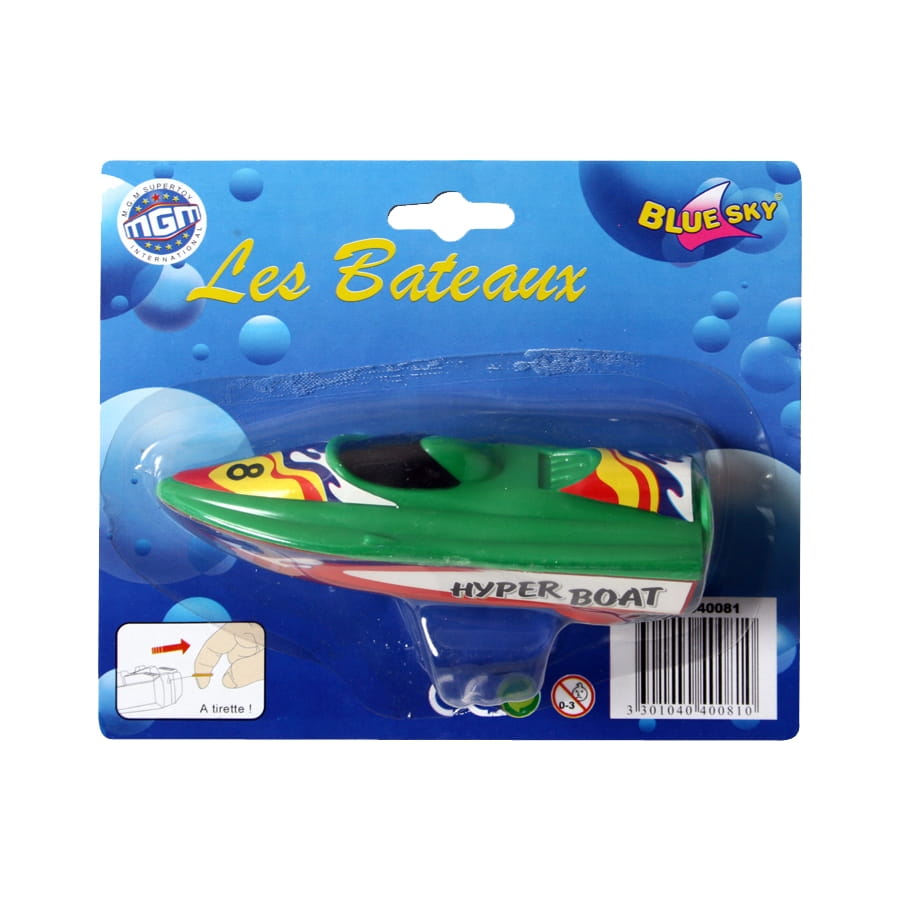 Bateau à tirette, pour enfants, mesurant 13 centimètres de long. Tirez sur la tirette et relâchez pour faire avancer le bateau. Il vous sera impossible de choisir le modèle ou la couleur lors de la commande. Le bateau sera livré comme présenté.