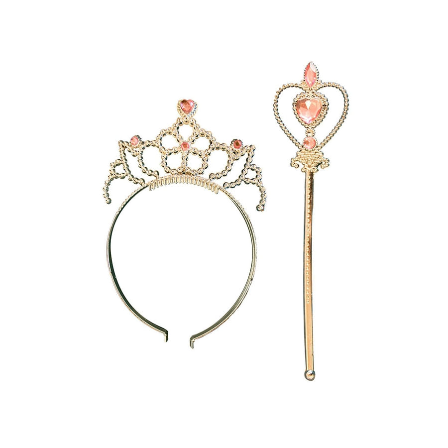 La couronne consiste en un serre-tête aspect métallique sur lequel est monté une tiare formée de nombreux motifs dorés sertis de fausses pierres précieuses roses.