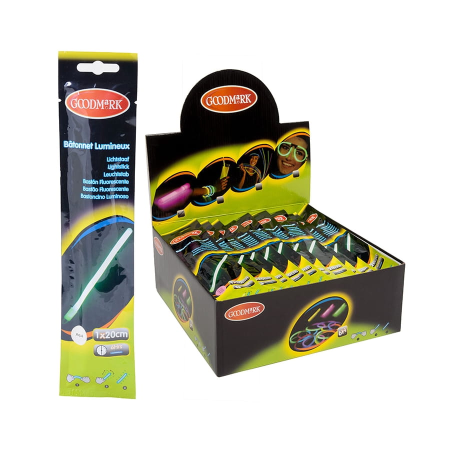 Le bâton est un tube de 1 x 20 cm ou de 1 x 10 cm selon le choix, disposant de 2 substances chimiques qui se mélangeront par flexion pour un éclairage fluo pendant 6 heures.