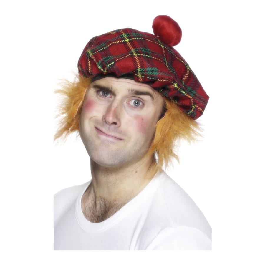 Béret d'Ecossais de couleur rouge et verte, avec pompom rouge et cheveux roux, pour homme ou adolescent. Cet accessoire sera parfait pour une fête folklorique ou pour un festival spécial Ecossais.