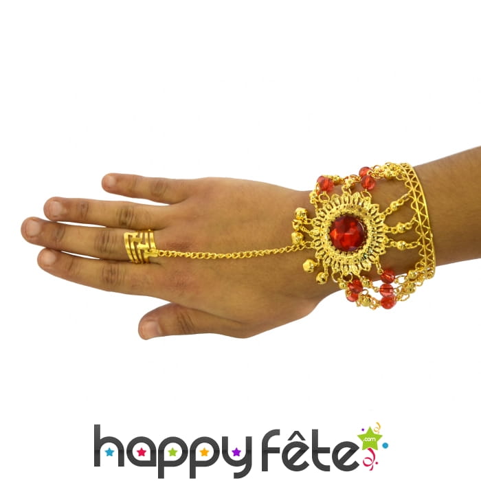 Pour une soirée toute en splendeur, déguisez-vous en une belle danseuse orientale. Ce bijou de main correspond parfaitement au thème des mille et une nuits. Il est formé d'un magnifique bracelet orné de pierres rouges surmonté d'une bague. Le tout est de couleur or et bronze. Vous pouvez aussi le porter avec une robe de soirée classique, il apportera toute l'élégance nécessaire à votre tenue.