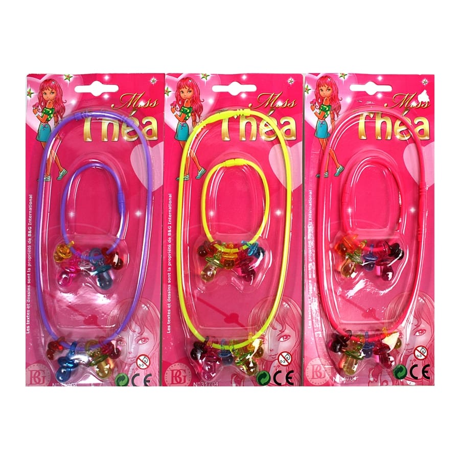Un peu coquette mais toujours aussi mignonne, votre petite fille sera parfaite avec ces nouveaux bijoux. Il s'agit d'un ensemble de collier et de bracelet multicolores, sous licence Barbie. Ils sont munis de pendentifs en forme de tétine de différentes couleurs, pour un côté fantaisie. Ce fantastique article existe en divers coloris, dont le rouge, le jaune ou le rose. Allez, Maman, un petit caprice, juste pour une fois ! Il n'est pas possible de choisir la couleur de l'ensemble, vous recevez une couleur prise au hasard dans le stock. Pour recevoir différentes couleurs, ajoutez plusieurs fois l'article à votre panier.