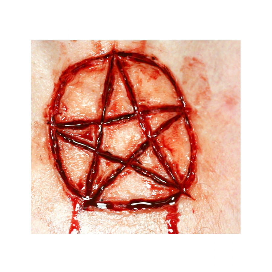 L'accessoire est formé d'un maquillage représentant un pentacle ensanglanté et trois blessures.