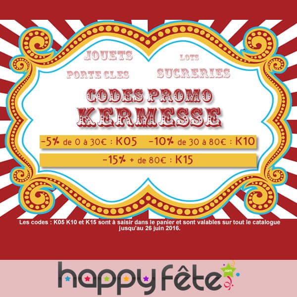 A l'occasion de la période des kermesses, happyfete vous propose des codes promotionnels vous permettant de profiter de -5 à -15% de réduction.