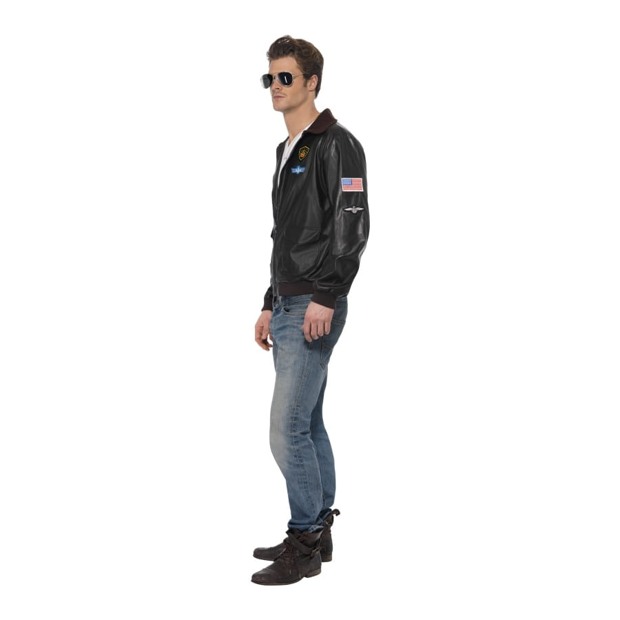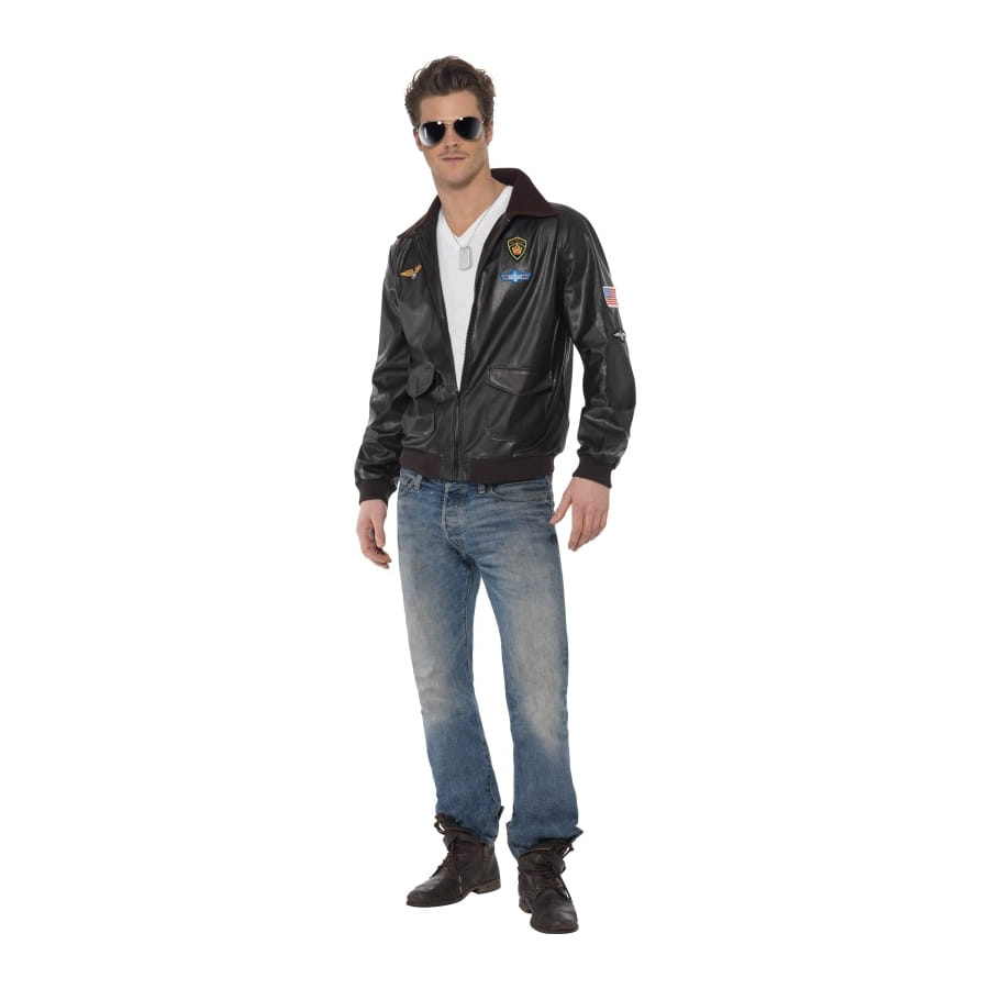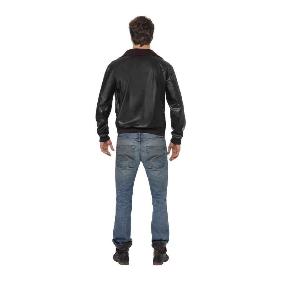 Déguisement d'aviateur, pour homme, composé d'un blouson en simili cuir de couleur noire avec motifs d'aviation. Agrémentez votre tenue d'une paire de lunettes d'aviateur et le tour sera joué! Le blouson est disponible en taille S, M ou L.