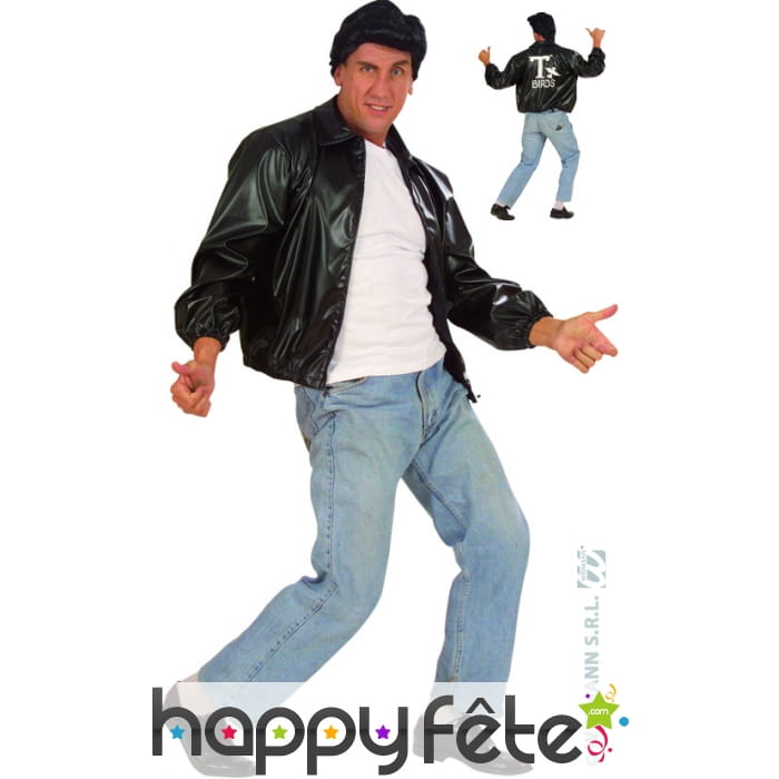 Incarnez in beau rockeur avec ce blouson en imitation cuir de couleur noir. Cet accessoire est parfait pour une soirée années 70-80 ou pour une fête inspirée du film "Grease".