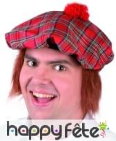 Ce chapeau est confectionné à la façon d'un bob et présente une surface décorée de carreaux blancs sur un fond rouge.