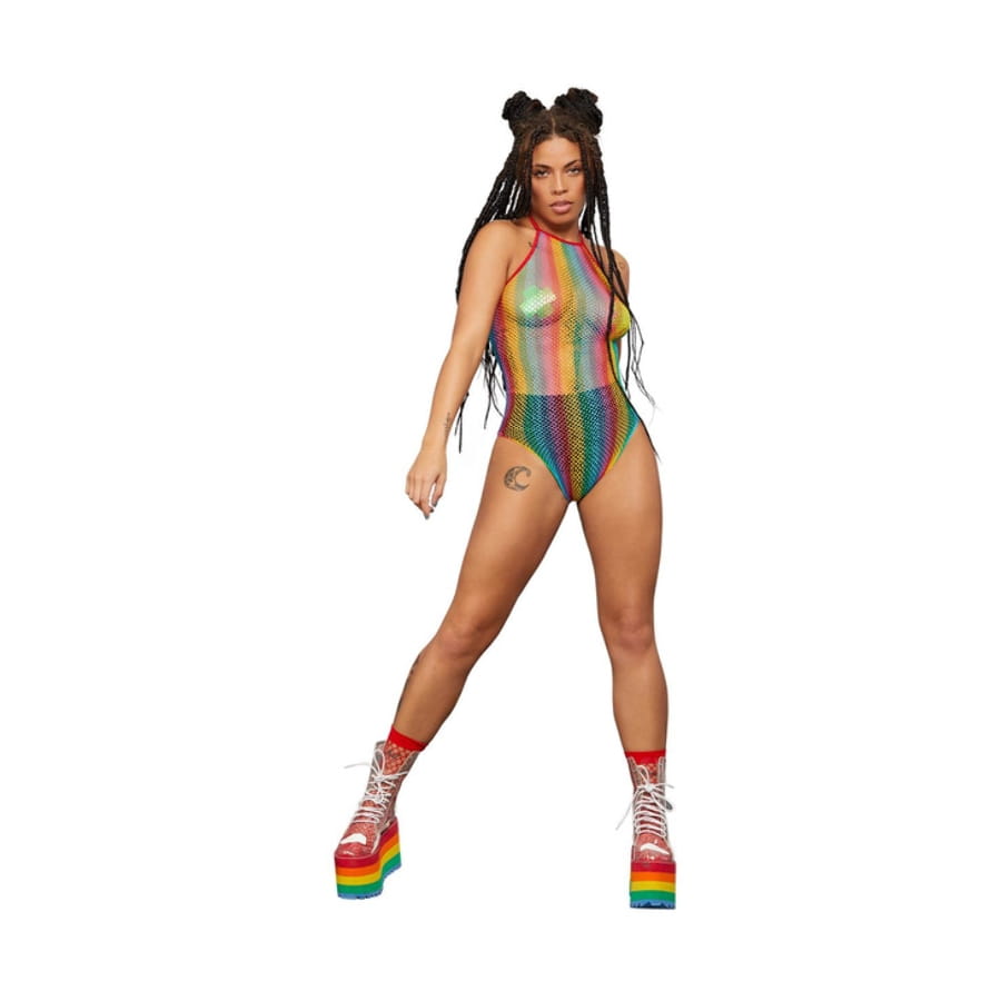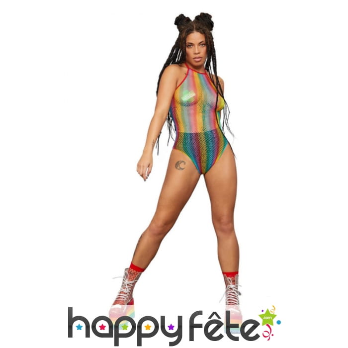 Jouez les séductrices déchaînées à l'occasion d'une soirée entre amis, avec le body transparent arc-en-ciel en résille.