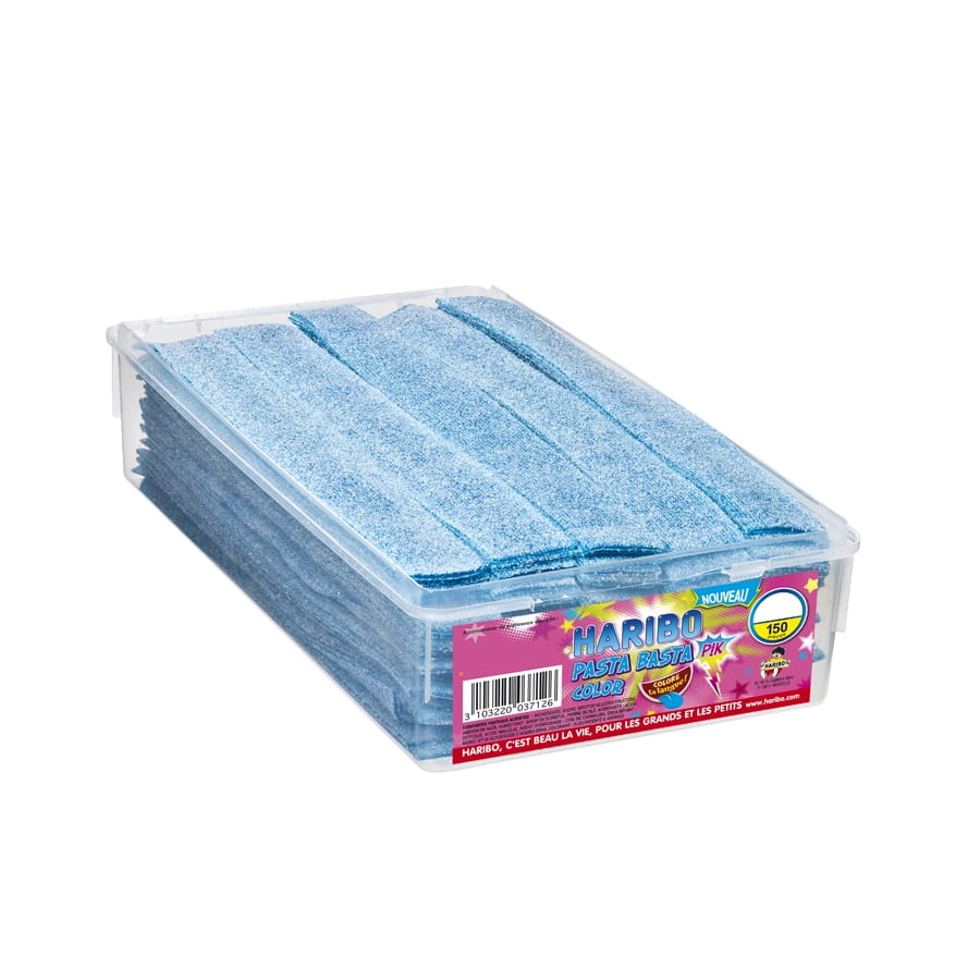 Boîte de bonbons Haribo contenant 150 Pasta Basta Pik au goût de mûre acid et pétillant. Les bonbons sont de couleur bleue et sont longs et plats. Offrez-les à vos invités lors de fêtes d'anniversaire ou autre soirées que vous organisez.