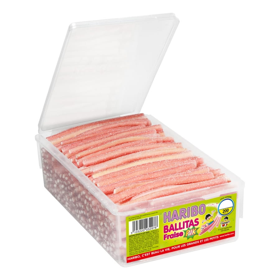 Vous ferez la joie des petits et des grands en optant pour ces bonbons ! Nous vous proposons toute une boite de 200 Haribo Ballitas fraise, idéale pour un lot de kermesse, ou tout simplement pour vous faire plaisir. De couleur rouge, elle contient 200 bonbons succulents et acidulés. Vous ne pourrez plus vous en passer.