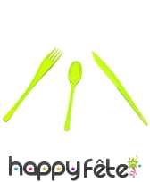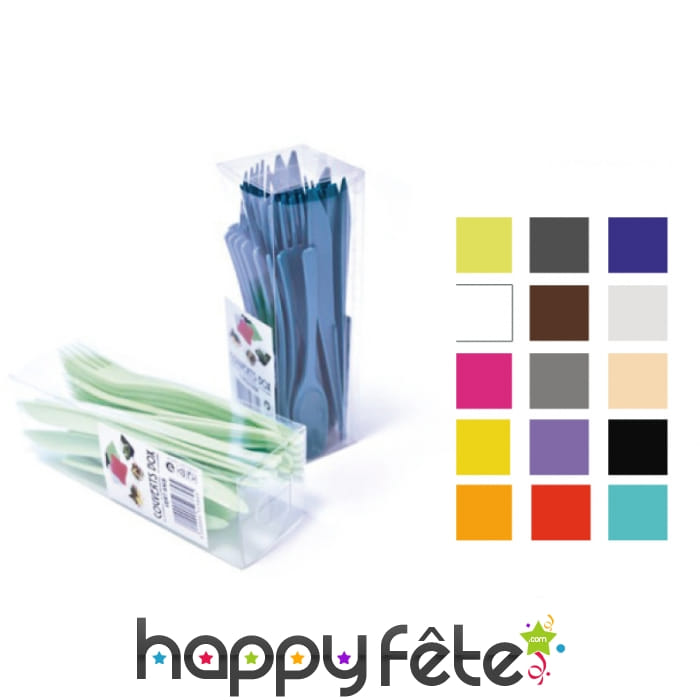 Pour un dîner entre amis, de beaux couverts sont de circonstance ! Montrez-leur que vous êtes le roi de la table, et qu'un bon dîner rime avec belle décoration et bonne cuisine ! Nous vous conseillons ces beaux couverts de couleur vert anis. Vous disposerez de toute une boîte de 30 couverts contenant 10 couteaux, 10 fourchettes et 10 cuillères. Nous vous proposons le même modèle en d'autres couleurs : ardoise, aubergine, blanc, chocolat, cristal, fushia, gris, ivoire, jaune, lilas, noire, orange, rouge et turquoise.
