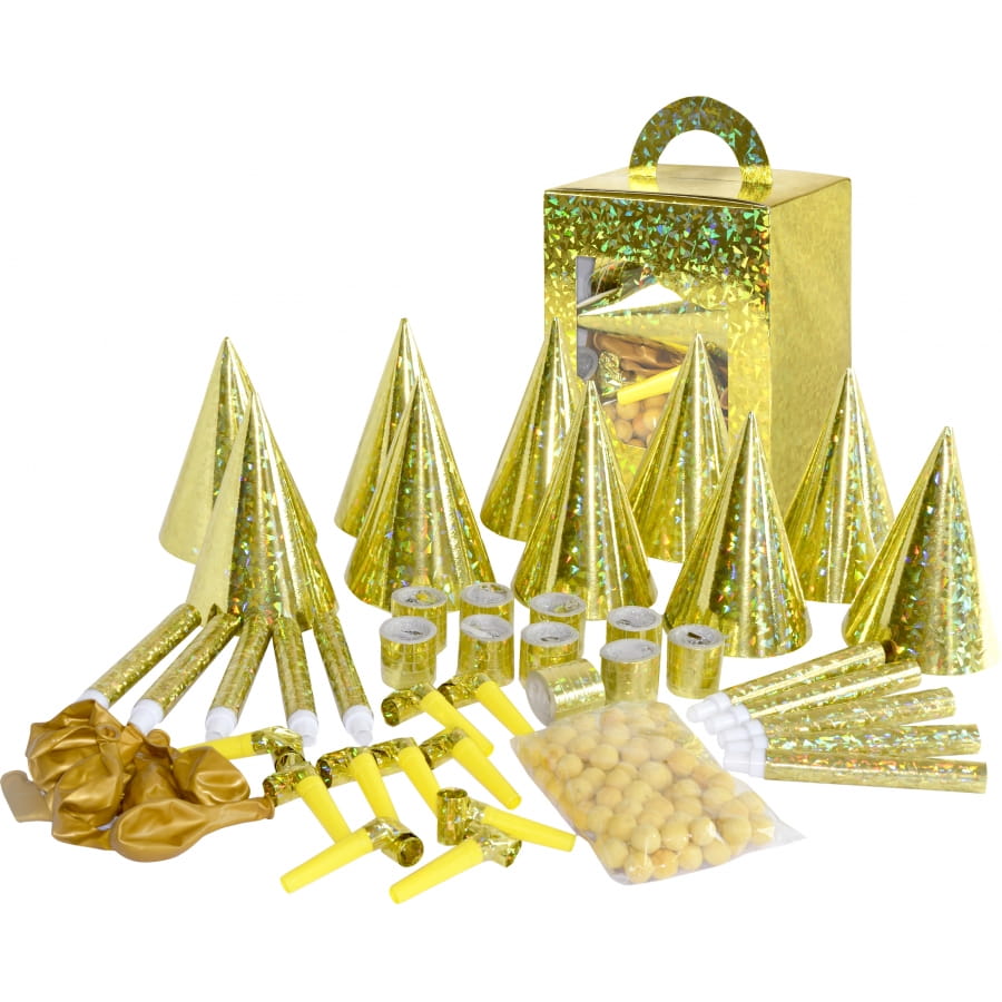 Kit de fête constitué d'une boîte de cotillons composé de 10 sarbacanes, 100 boules dancing, 10 rouleaux de serpentins, 10 chapeaux, 10 sans-gêne et 10 ballons, tous de couleur dorée. Ce kit est idéal pour un carnaval, un anniversaire, la Noël ou le Nouvel An.