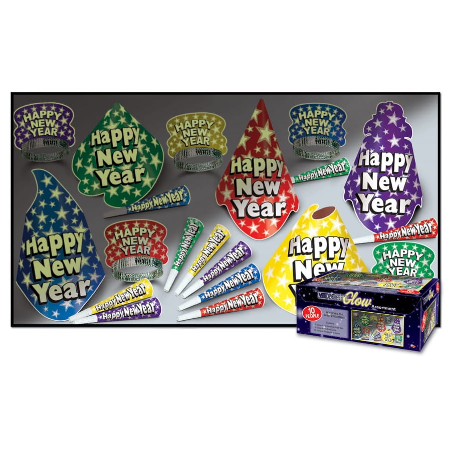 Cette boîte d'assortiment de cotillons phosphorescents vous sera très utile pour fêter dignement la fin d'année entre amis. Pour 10 personnes, elle contient 5 chapeaux fluo pour homme, 10 tiares fluo pour femme ainsi que 10 cornes à musique fluo également. Ces accessoires réagissent à la lumière noire. Idéal donc pour des sorties en boîte de nuit.