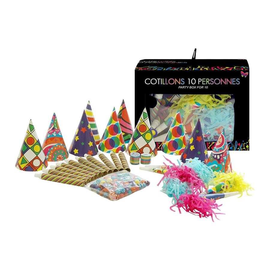 Préparez une ambiance de fou lors du prochain carnaval à l'occasion du nouvel an, grâce à la boîte de cotillons multicolores pour 10 personnes.