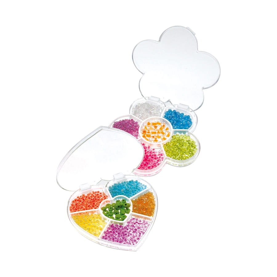 Boîte contenant de magnifiques perles à bijoux en verre. Il existe un modèle de boîte en forme de coeur et un autre en forme de fleurs et tous deux contiennent des couleurs de perles différentes. Chacune des boîtes mesure 7.5 sur 10 centimètres. Vous n'aurez pas la possibilité de choisir entre les deux modèles, un des deux vous sera automatique livré.