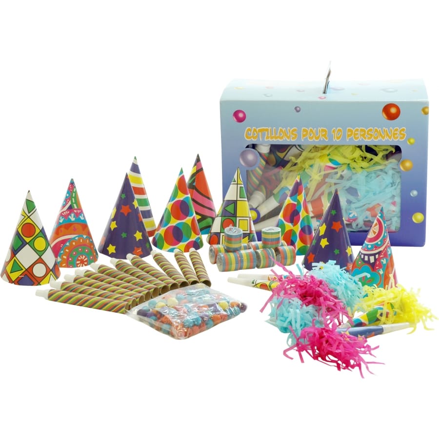 Pour vos anniversaires, laissez-vous tenter par cette boîte de présentoir composée de 10 sarbacanes, 100 boules dancing, 10 sans-gêne, 10 rouleaux de 5 serpentins et 10 coiffes, tous multicolores. Ce kit est parfait pour un anniversaire, un carnaval ou pour le Nouvel An.