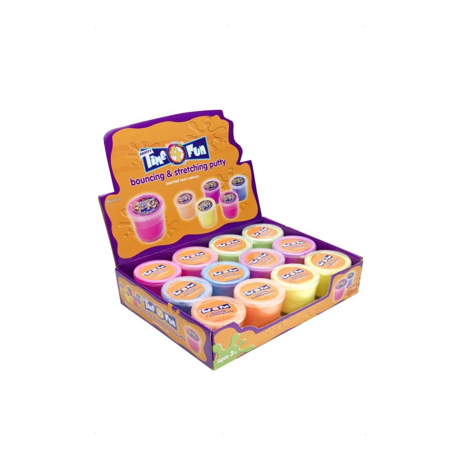 Boîte contenant 12 pots de matière multicolore visqueuse rebondissante et extensible. Avec ce mastic, les enfants pourront faire les formes qu'ils voudront ou s'en servir comme boule!