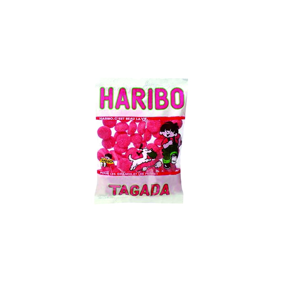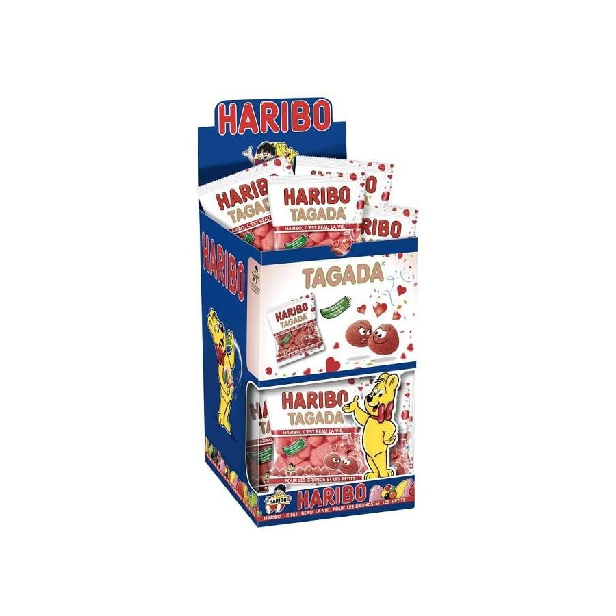 Boîte contenant 30 sachets d'Haribo Tagada. Les bonbons sont de couleur rose, en forme et au goût de fraise. Ils sont délicieux et rendront accro les invités!