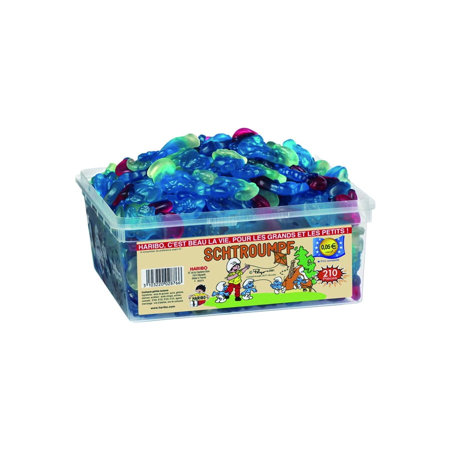 Bonbons Haribo Schtroumpf de couleur bleu transparent. Ces bonbons sont en forme de mini Schtroumpfs et sont vendus en boîte de 210. Placez-les sur votre table et les enfants en raffoleront!