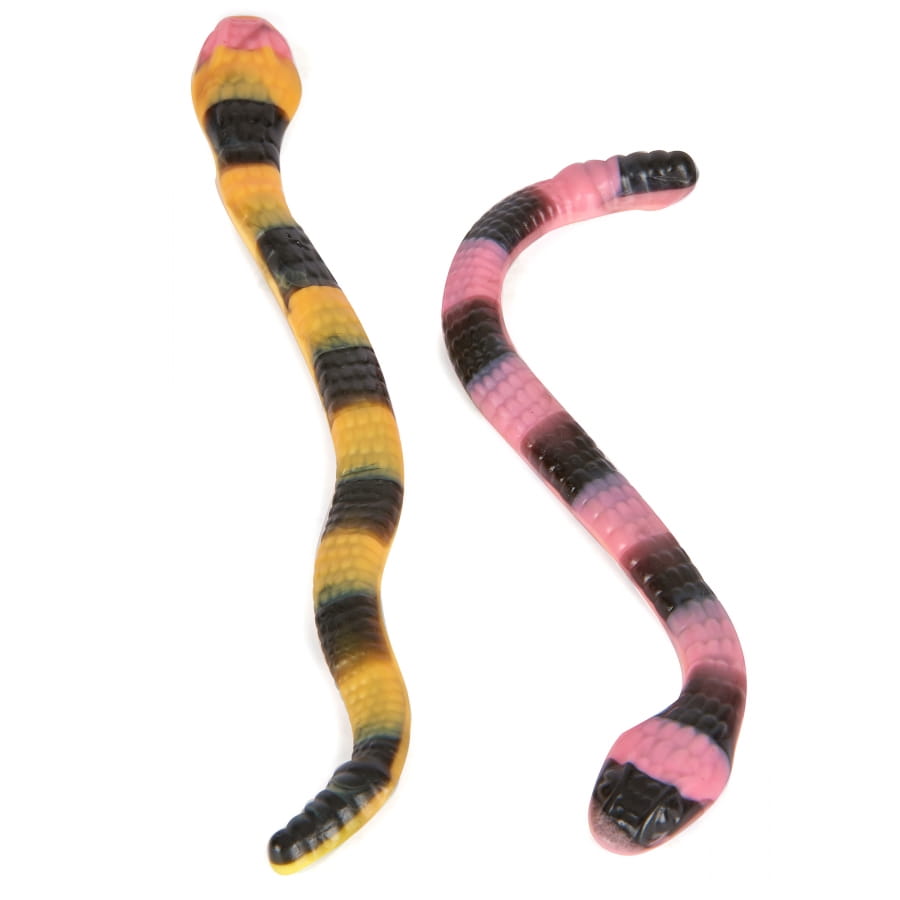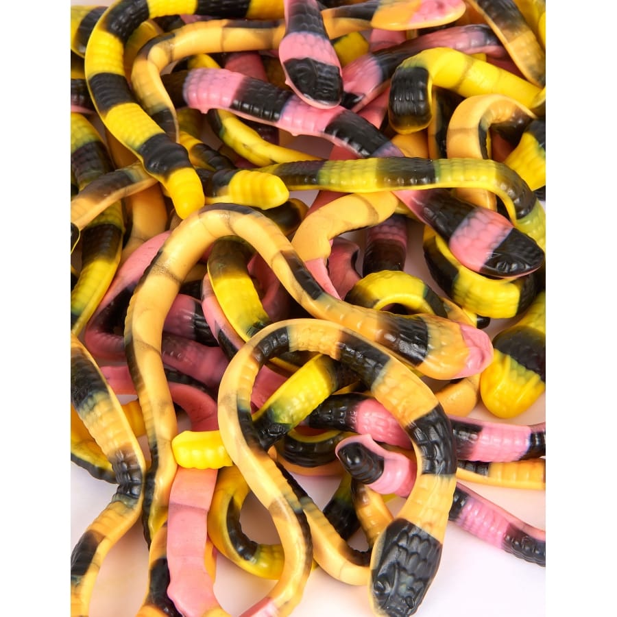 Ces Bonbons Pit le python 1kg sont en forme de serpents multicolores (noir, jaune et rose).