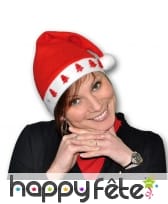 Le chapeau est rouge dans son ensemble, orné d'un pompon blanc à la pointe, et d'une fourrure blanche à la base.