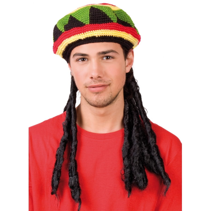 Adoptez un look décontracté en vous initiant au style vestimentaire rasta. Ce bonnet de rasta avec dreadlocks va totalement vous transformer. Il s'agit d'un béret aux couleurs rasta : noir, vert, jaune et rouge. Il est équipé de dreadlocks noirs bien épais qui retomberont sur vos épaules. Ce couvre-chef à la fois bonnet et perruque complétera à merveille votre déguisement de rasta.