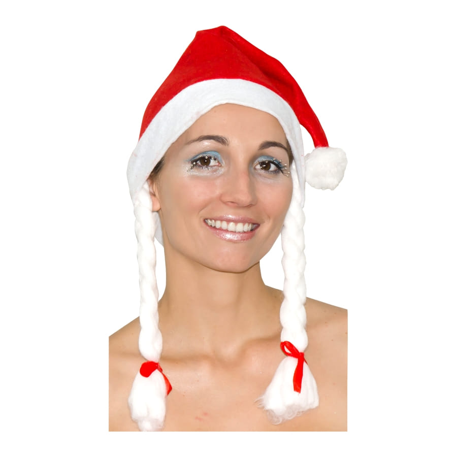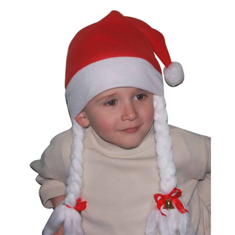 Adorable bonnet de Noël en feutrine rouge et blanc avec 2 nattes blanches. Cet accessoire est parfait pour mettre votre enfant dans l'ambiance de Noël. Disponible en taille enfant et taille adulte.