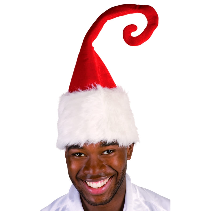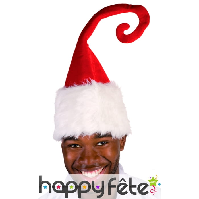 Joli bonnet original de Père Noël Curly rouge et blanc. Cet accessoire est parfait pour compléter une tenue de Père ou de Mère Noël un peu excentrique.