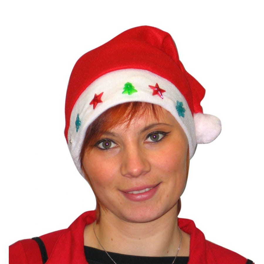 Ravissant bonnet de Noël rouge lumineux et agrémenté de motifs inspirés de Noël de couleur bleue, rouge et verte. L'accessoire est livré avec piles. Il est idéal pour se transformer en Père ou Mère Noël.