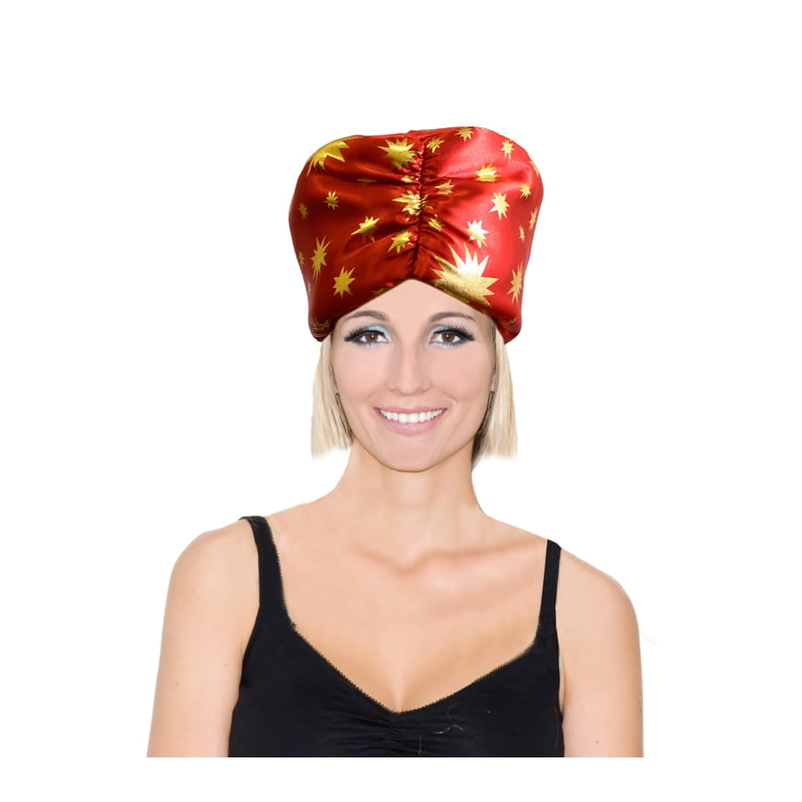 Restez tendance, même en Mère Noël ou Père Noël, avec une coiffe hors du commun. Elle est de couleur rouge avec des dessins d'étoiles dorées dessus. Et elle a été fait en velours pour le confort de celui ou celle qui le portera. Et choisissez bien la tenue que vous porterez, avec car un aussi joli bonnet doit être assorti avec une magnifique tenue!