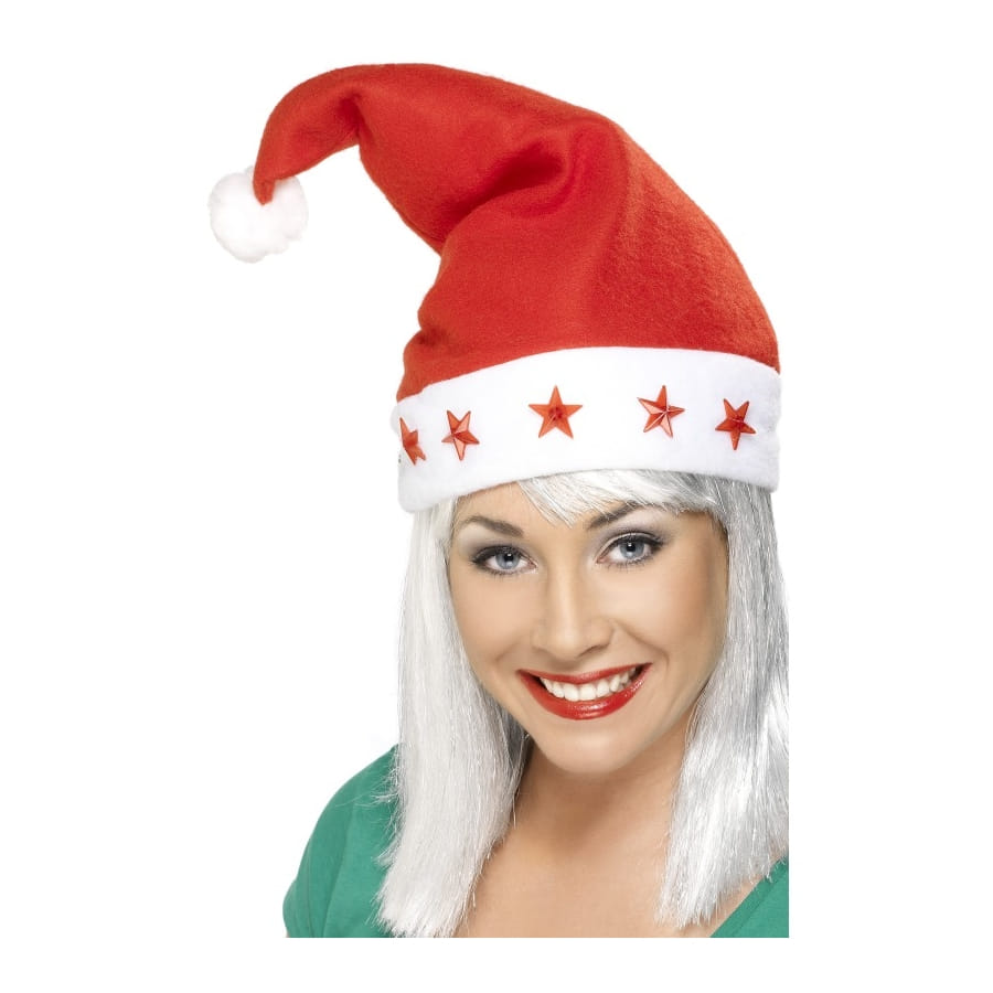 Bonnet de Père Noël lumineux de couleur rouge et blanche, pour homme, femme, adolescent ou adolescente. Le rebord du bonnet est blanc avec de très jolies petites étoiles rouges qui s'allument. Ce bonnet est l'accessoire idéal pour fêter Noël en toute gaieté!