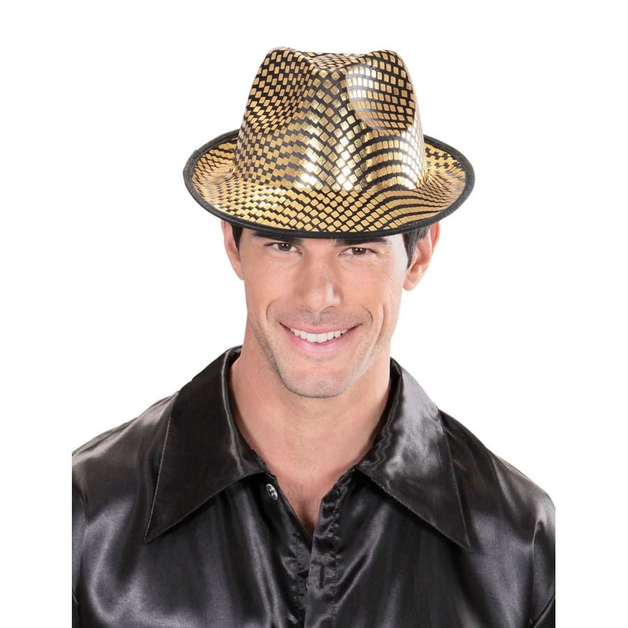 À l'occasion d'une fête costumée, d'un carnaval ou du Nouvel An, vous allez ressembler à Al Capone ou à Michael Jackson avec ce borsalino noir avec petits carreaux dorés pour adulte.