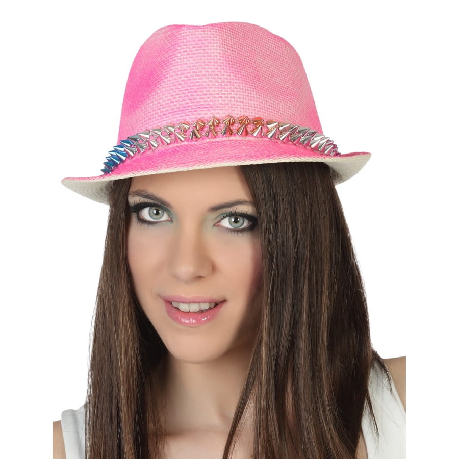 Le borsalino rose clouté multicolore de 13 x 28 cm est un chapeau pour femme.