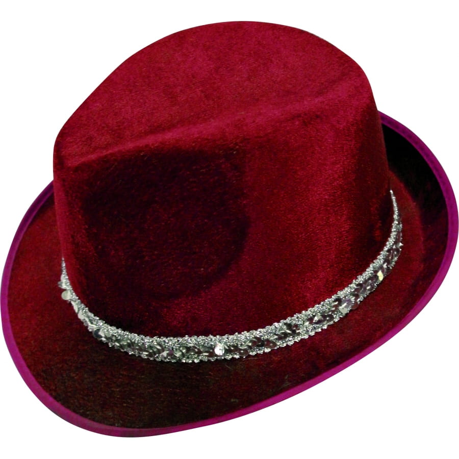 Borsalino pour femme. Cet accessoire est entièrement en velours de couleur rouge avec un ruban en paillettes en guise d'ornement. Il est d'une très belle qualité et vous donnera un air chic et élégant pour une soirée cabaret.