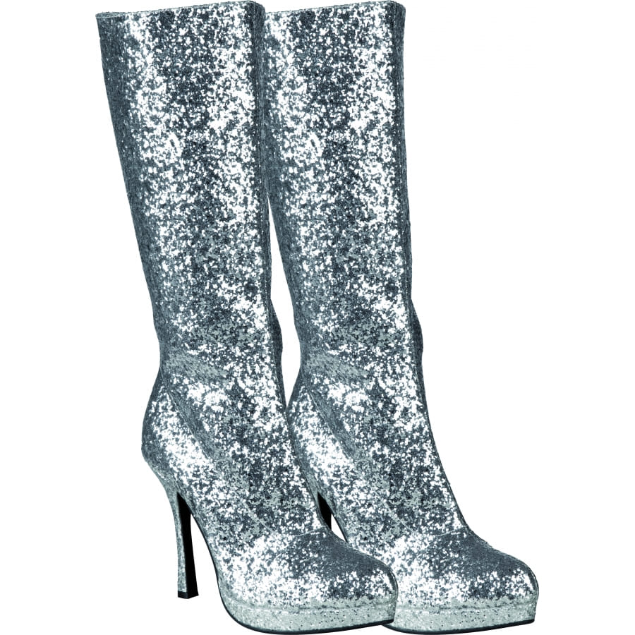 Bottes à talons recouvertes de paillettes argentées, pour femme. Vous aurez la possibilité de choisir entre une pointure de 37-38 ou de 39-40. Elles sont parfaites pour un déguisement de danseuse disco ou pour une tenue de drag queen.