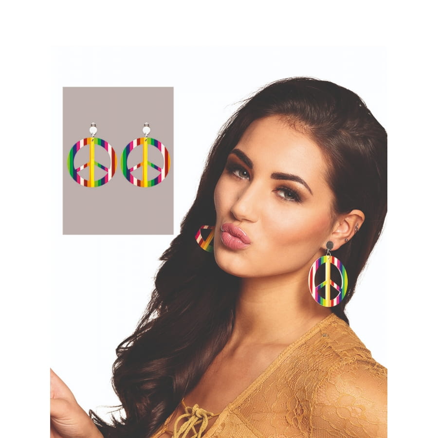 Les boucles d'oreilles symbole Peace and love colorées pour femme sont en plastique.