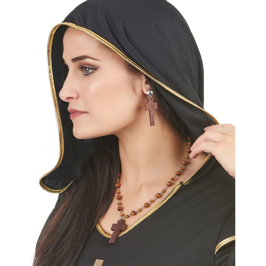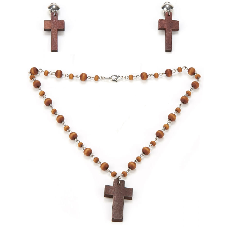 Pour parfaire votre déguisement de religieuse, n'hésitez pas à accessoiriser votre tenue avec cet ensemble boucles d'oreilles et collier croix en bois marron.