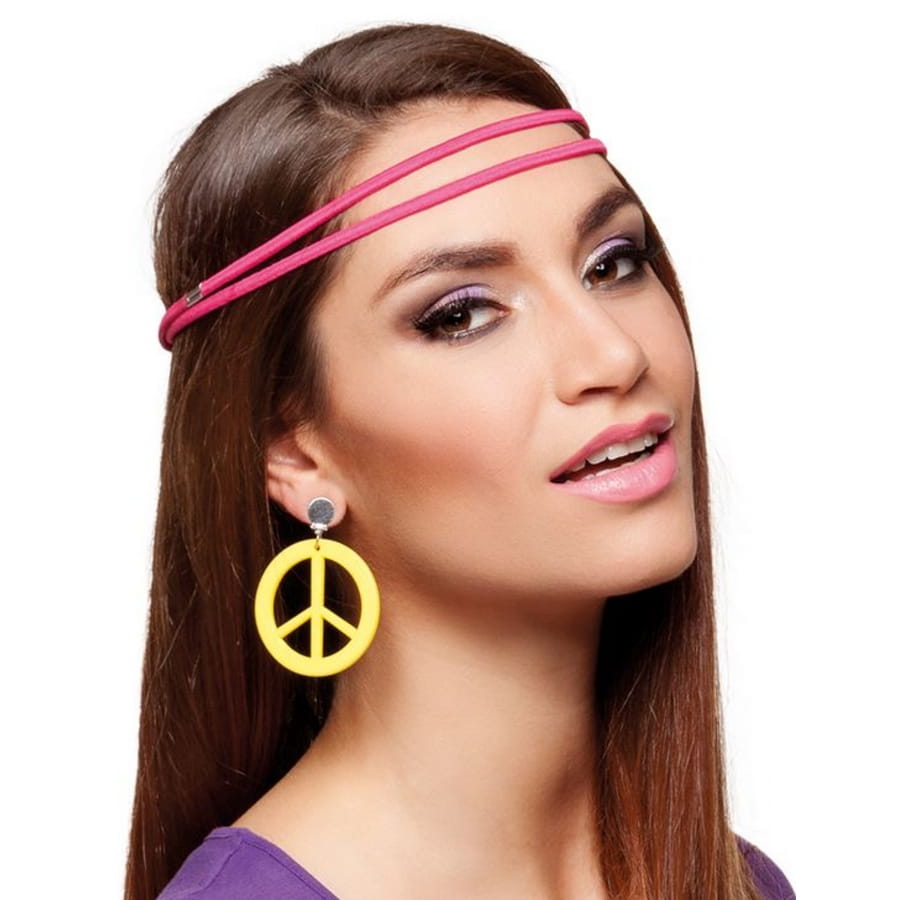 Pour embellir votre tenue de hippie lors d'une fête déguisée, quoi de mieux que ces boucles d'oreilles peace and love jaunes ?