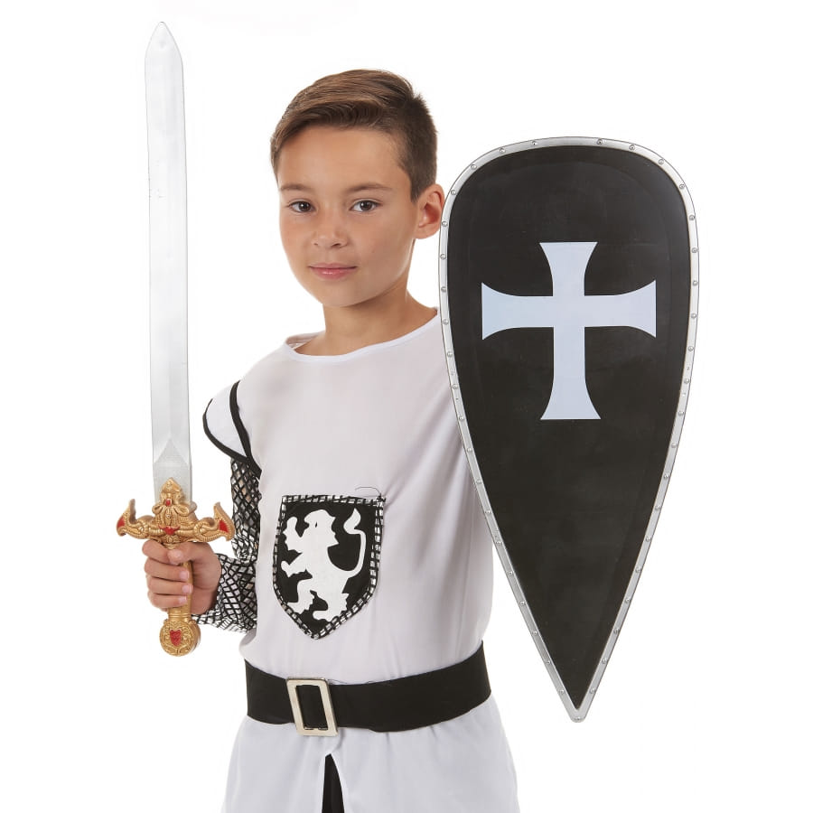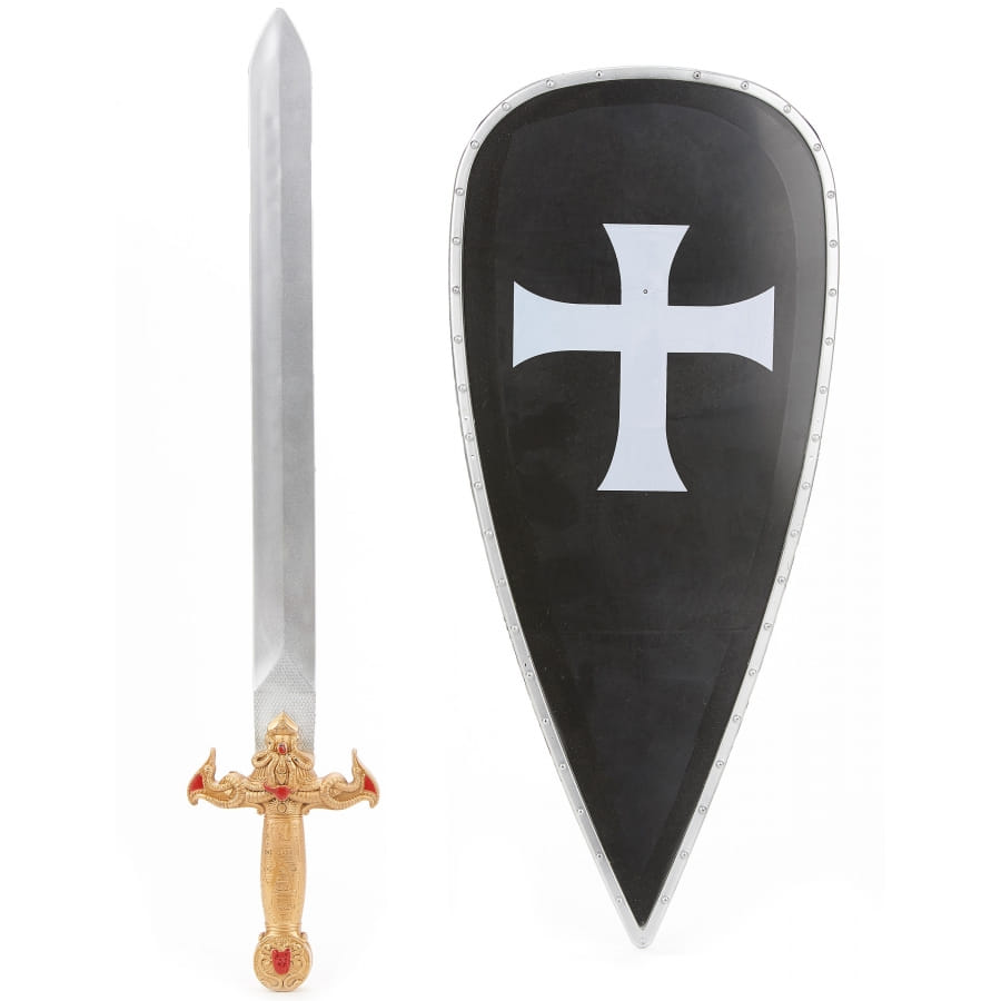 Le kit est constitué d'un bouclier noir (54 x 24cm) imprimé d'une croix blanche ainsi que d'une épée en plastique semi-rigide dotée d'une lame argentée (60cm), avec une garde de couleur rouge et dorée (en relief).