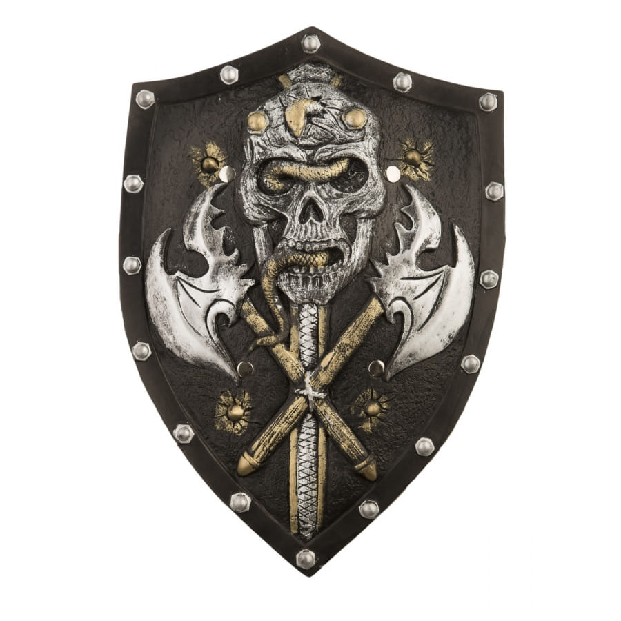 Ce bouclier est agrémenté au centre d'une tête de mort, dans laquelle se trouve un serpent enroulé, depuis l'intérieur de la bouche, jusqu'aux yeux du crâne.