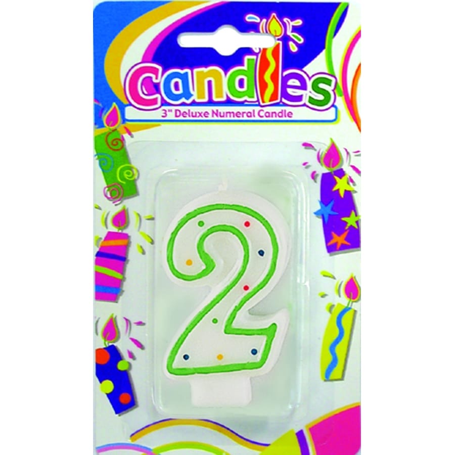 Bougie d'anniversaire blanc et vert en forme de chiffre 2. Cet accessoire est indispensable pour agrémenter votre gâteau d'anniversaire.