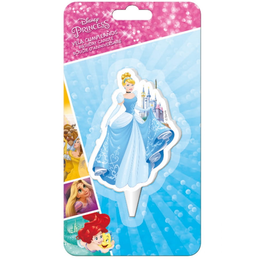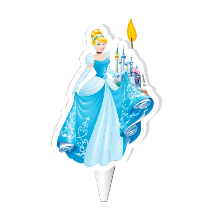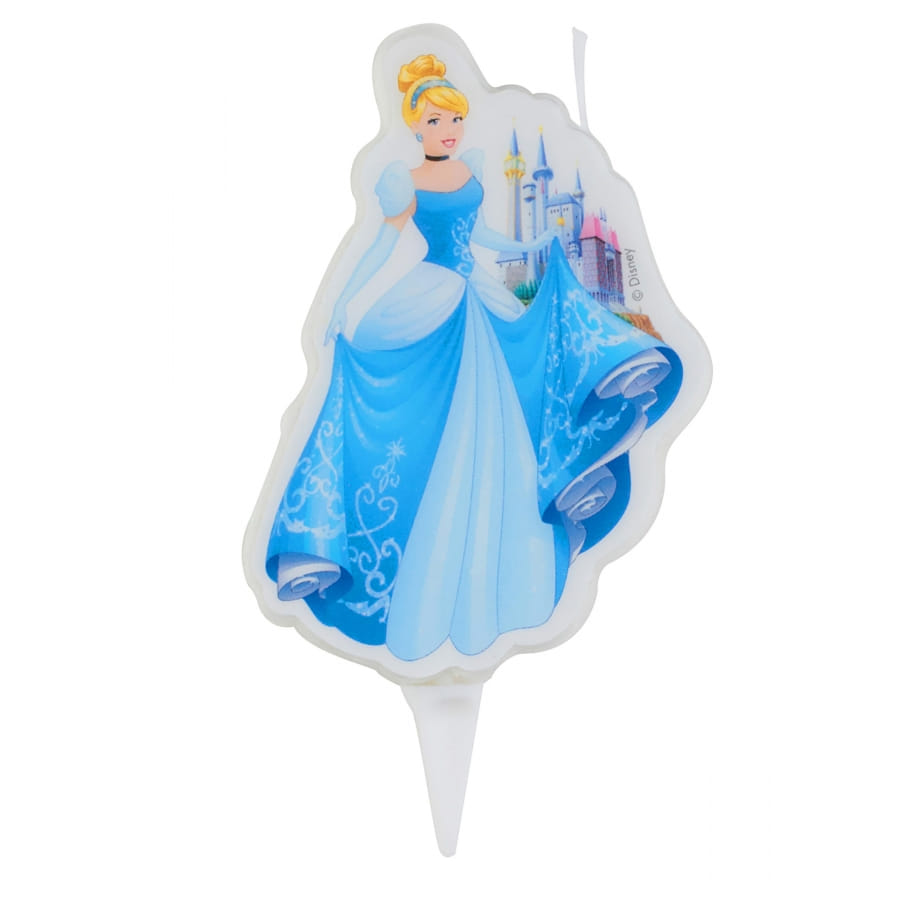 Cette bougie possède un support en plastique blanc qui pourra être piqué dans le gâteau. Sa partie supérieure représente la magnifique princesse Cendrillon dans une robe bleue avec en fond d'écran son fabuleux château.