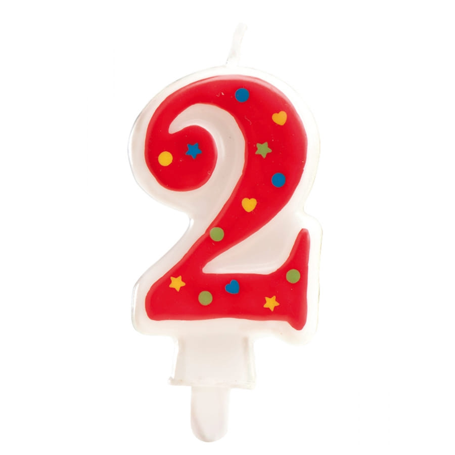 Fabriquée en cire blanche, ce modèle en forme de chiffre 2 est de couleur rouge sur le devant, agrémenté de petits motifs colorés tels que des étoiles, des coeurs ou des pois.