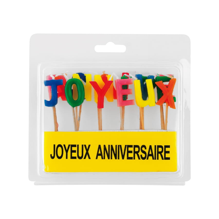 L'ensemble multicolore des bougies forme le mot "Joyeux Anniversaire".